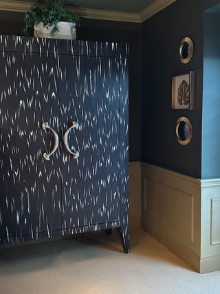 Goodbye, delicate cherry-and-mahogany set—hello, presence. This space now features a grand, weathered dining table, paired with a striking, paint-splattered armoire that looks like it moonlights as modern art. Ultra-comfortable upholstered host chairs invite long, lingering dinners, while two soon-to-be-reupholstered vintage chairs (courtesy of our incredibly talented workroom) will add even more character and charm.