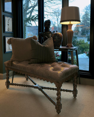 Not just a living room—this space was transformed into a destination. And at its heart? The green leather sofa (as seen in Architectural Digest), effortlessly commanding attention like the star it is. Our client’s beloved vintage brass and jacquard lamps set the mood, while a perfectly off-centre statement artwork adds a dash of unexpected charm. Layers of texture bring it all together—from a hide rug over the broadloom to a tufted floating bench that says, "sit here and stay awhile." The vintage wall unit got a stylish refresh, proving that old-world charm and fresh perspectives are a match made in design heaven.