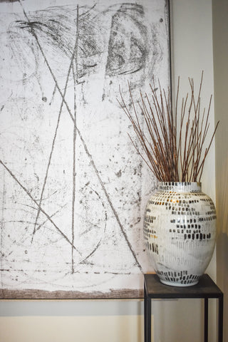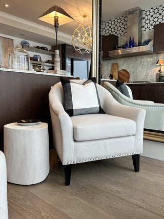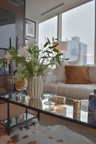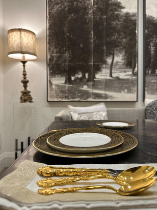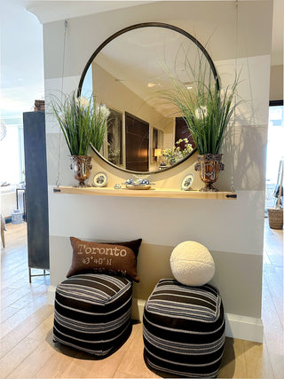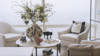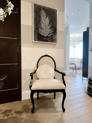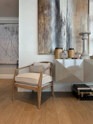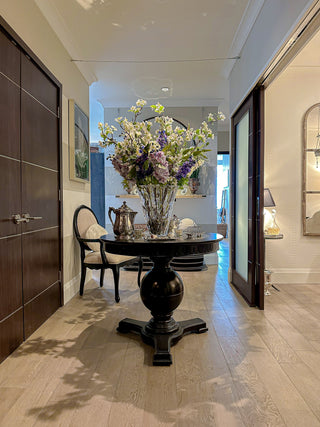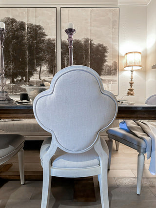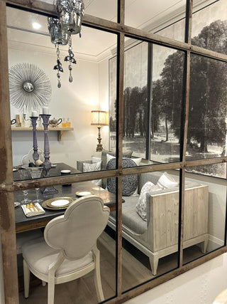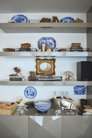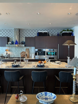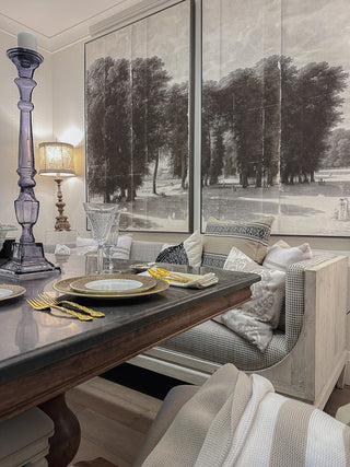 Step into the dining room, a small space adorned with grandeur. Here, a set of large framed prints command attention, their presence magnified by a strategically placed mirror that expands the room's sense of space. It's the little details that truly shine here – from the gleam of gold cutlery to the charm of antique plates, and the carefully selected fabrics on the chairs and bench. Even the inclusion of sleek acrylic side tables adds a touch of modern sophistication, showcasing a meticulous curation of elements that elevate the dining experience beyond the ordinary.