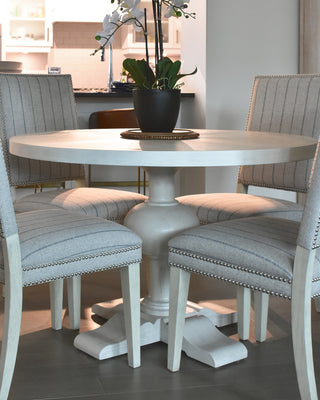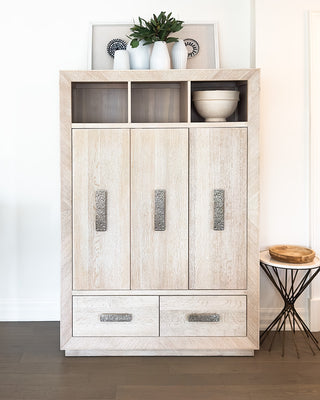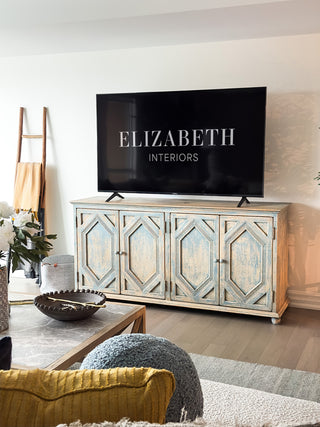 A stunning white dining table anchors the design, while textures unfold gracefully with a hand-knotted rug, rich fabrics, and natural woods adding depth and warmth. What began as love at first sight with a striking blue and yellow cabinet blossomed into a harmonious palette, layered with thoughtful details that creates an effortless sense of elegance.