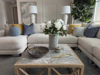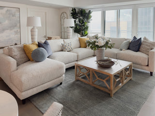 At the heart of the space, a grand sectional invites both relaxation and connection, with its plush cushions offering the perfect spot to gather, unwind, or sink into quiet comfort. A delicate blend of soft blues and golden root hues sets the tone, complemented by cloud-inspired artwork that whispers tranquillity.
