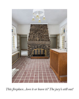 Meanwhile, the adjoining sunroom presents a unique design challenge—its rustic stone fireplace. “We’re either going to love it, or we’re going to hate it,” Liz says with a laugh. Right now, it looks like someone gathered rocks from the backyard and stacked them together. But there’s something charming about it, too.