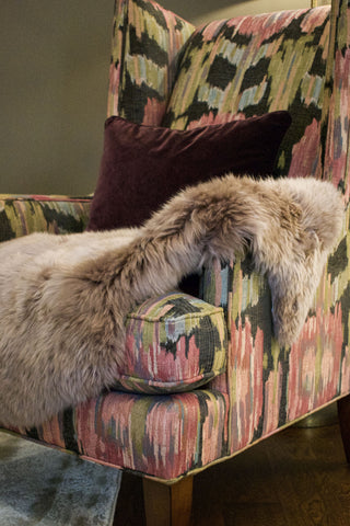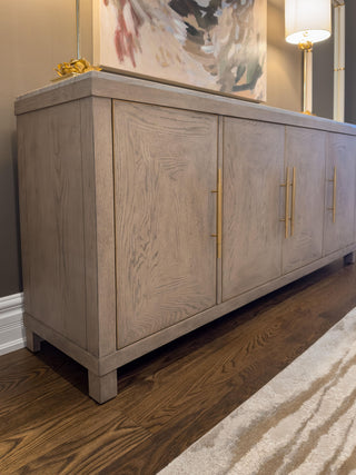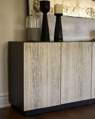 In the main living area, tone-on-tone textures bring a calm, cohesive feel. Warm taupes and soft neutrals are layered against rich dark wood tones, creating a space that feels both comfortable and refined. The sideboard reflects the deep brown cabinetry nearby from the kitchen and the entertainment space, tying the spaces together beautifully. A soft area rug anchors the room, adding texture and warmth, while stacked artwork draws the eye upward to emphasize the home’s impressive vaulted ceilings.