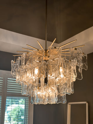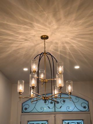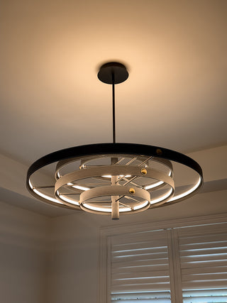 The Chandelier in the entryway casts a dramatic reflection across the ceiling, creating a warm and inviting first impression. In the office, a Leather Pendant adds modern and masculine notes. Its layered leather rings bring texture and visual interest, blending natural influence with contemporary design.