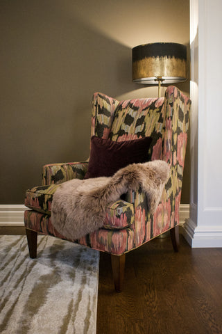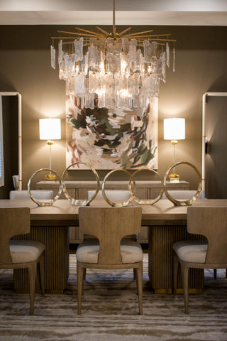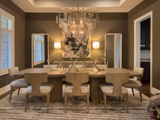 The dining room sets the tone for the entire home. The pinnacle award-winning dining table from Fairfield Chair commands attention, while an impactful chandelier and elegant mirrors create a stunning reflection that enhances the room’s sense of grandeur. The colour palette was designed to make a statement. Deep, dramatic walls create an elegant backdrop for soft neutral upholstery and artwork that mirrors the hues of the dining chairs. The result is a balance of glamour and comfort, perfect for entertaining in style.