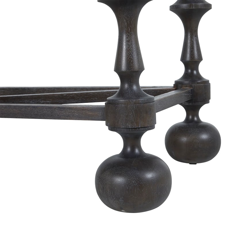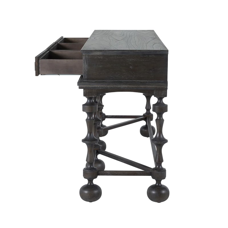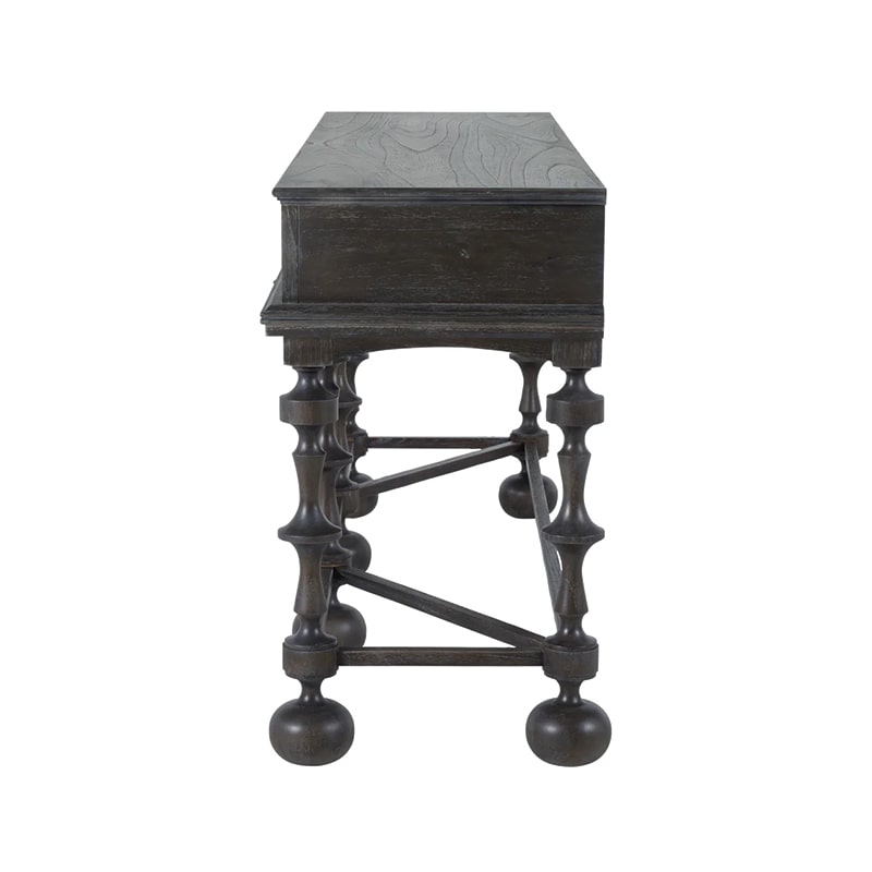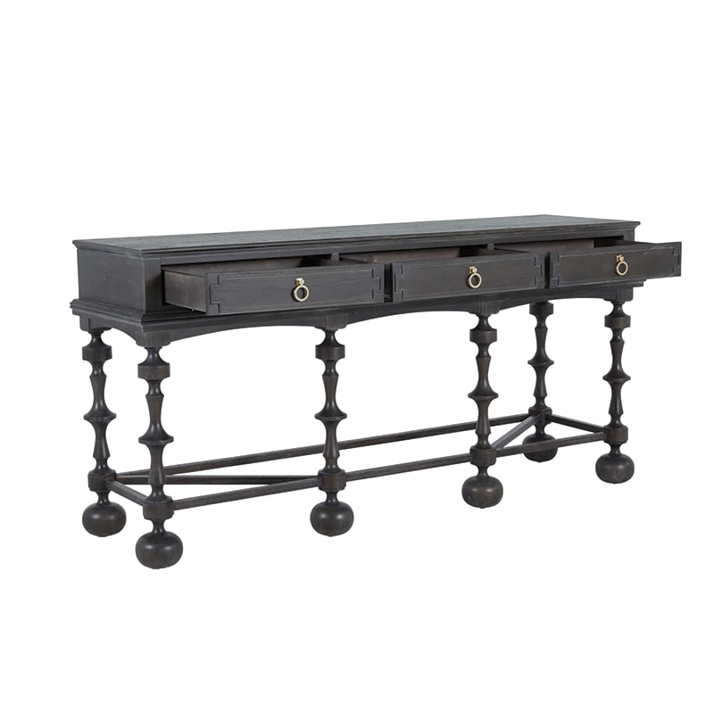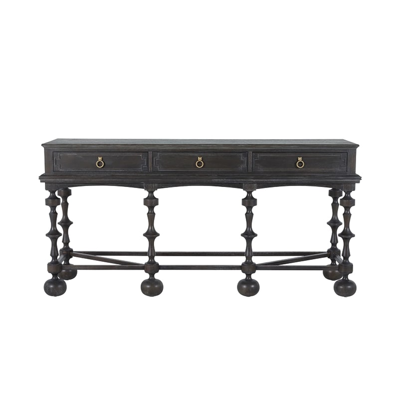 The Arrington Console Table brings refined elegance and bold artistic character to entryways and living spaces alike. Crafted with meticulous attention to detail, it features tall, distinctively turned legs that offer a contemporary twist on vintage-inspired design. Made from mindi and rubberwood and finished in a textured cerused ash, this sophisticated piece provides both visual interest and practical storage, making it a timeless addition to a variety of interiors.