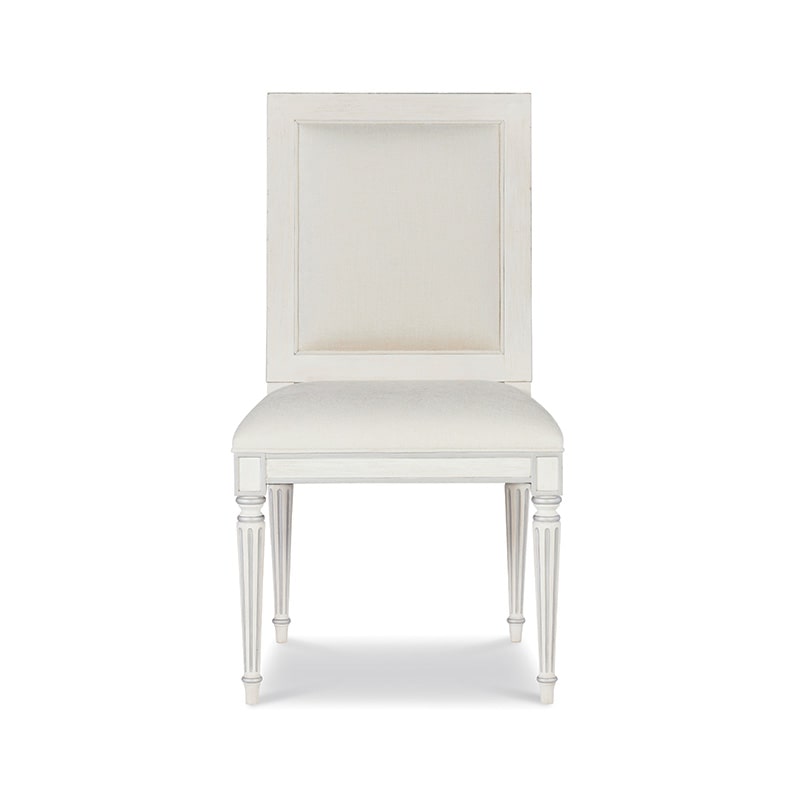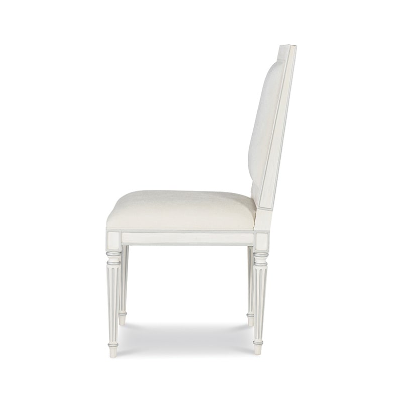 Regency-inspired elegance meets everyday comfort in the Barrington Side Chair. Its square back silhouette, fluted turned legs, and framed aprons are finished in a distressed antique white with silver accents, while natural linen upholstery adds soft texture and timeless appeal. Perfect for pairing with the Barrington Dining Table or as a standalone statement chair.