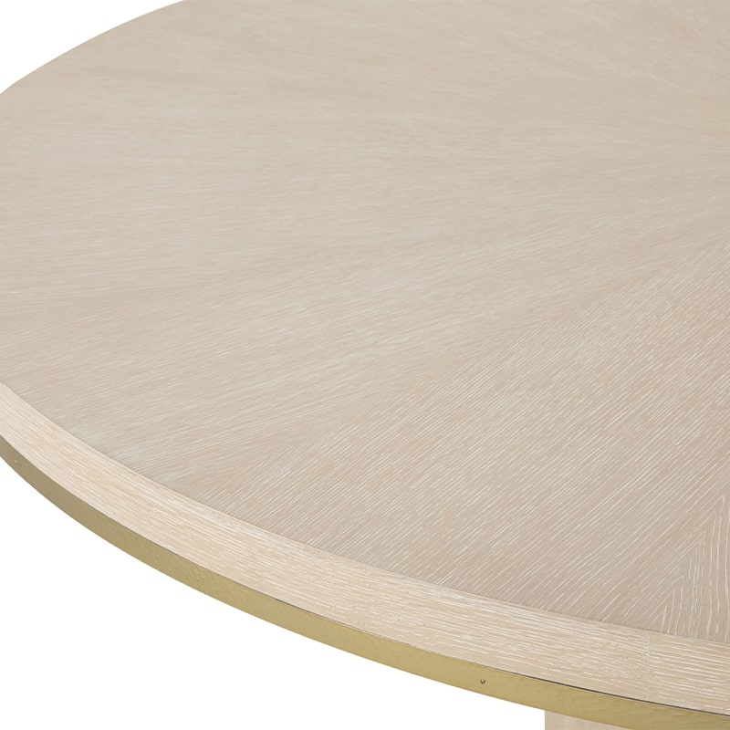 The Carino 64" Round Dining Table combines clean, modern design with natural elegance. Featuring a B32 Sand Cerused finish, its round oak top is paired with a base accented in textured Champagne metal trim for subtle sophistication. Perfect for intimate dinners or lively gatherings, Carino brings a refined, versatile centerpiece to any dining space.