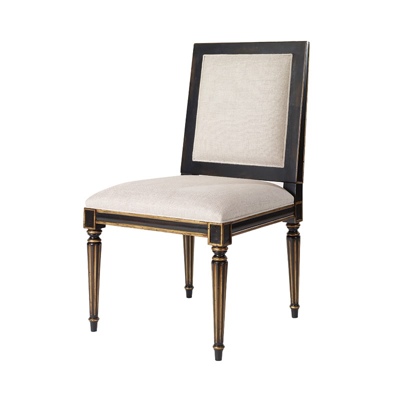 Elevate your dining experience with the Barrington Side Chair, where classic Regency style meets refined comfort. Its square back, fluted turned legs, and framed aprons are finished in distressed black with gold accents, complemented by natural linen upholstery for a soft, sophisticated touch. Perfect alongside the Barrington Dark/Gold Dining Table or as an elegant standalone piece.