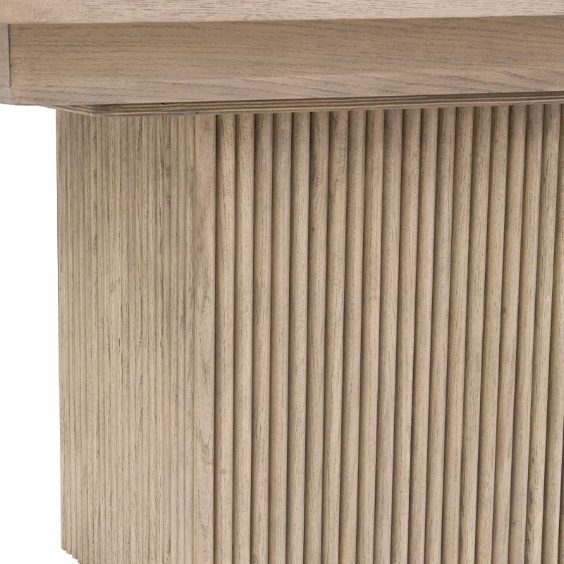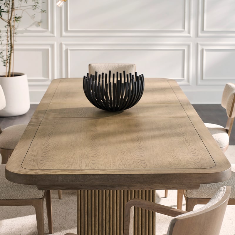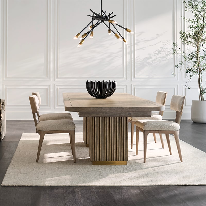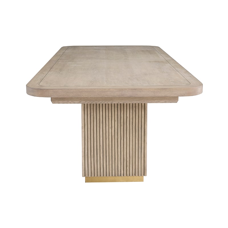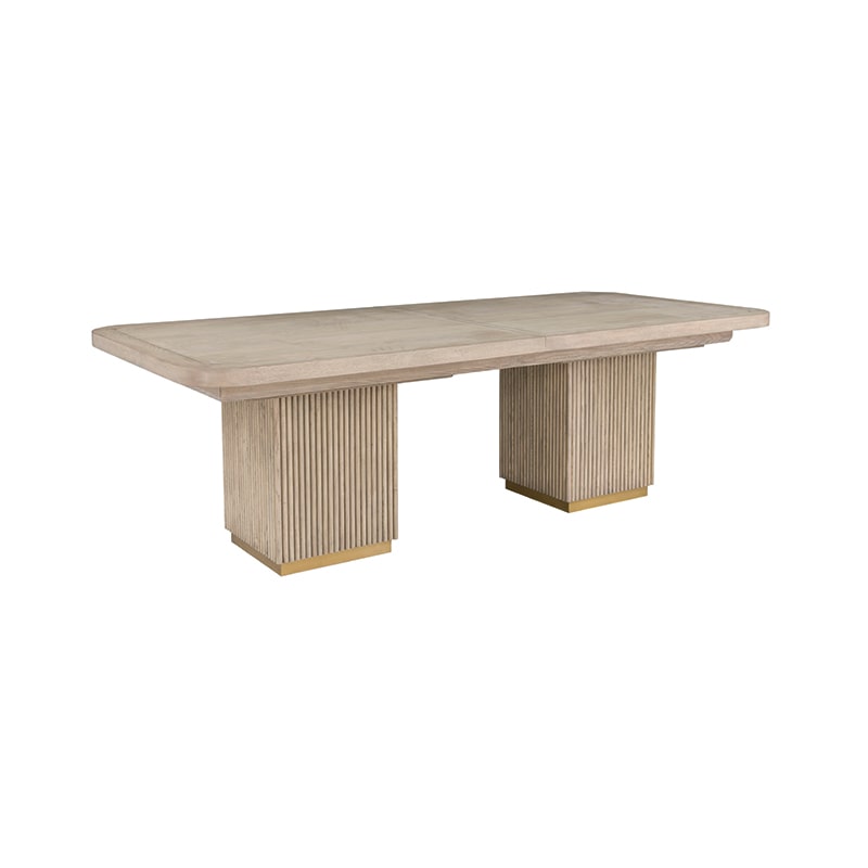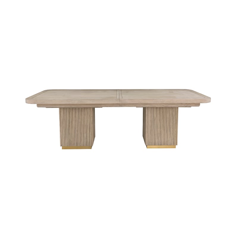 The Everett Dining Table embodies refined craftsmanship and modern warmth. Crafted from red oak solids and veneers, it showcases elegant tambour panel detailing and figured oak surfaces finished in a soft Biscotti tone. Resting on a brushed brass plinth base, this double pedestal design brings understated luxury to any dining space. Includes one 20" leaf extending the table to 116", perfect for gatherings of any size.